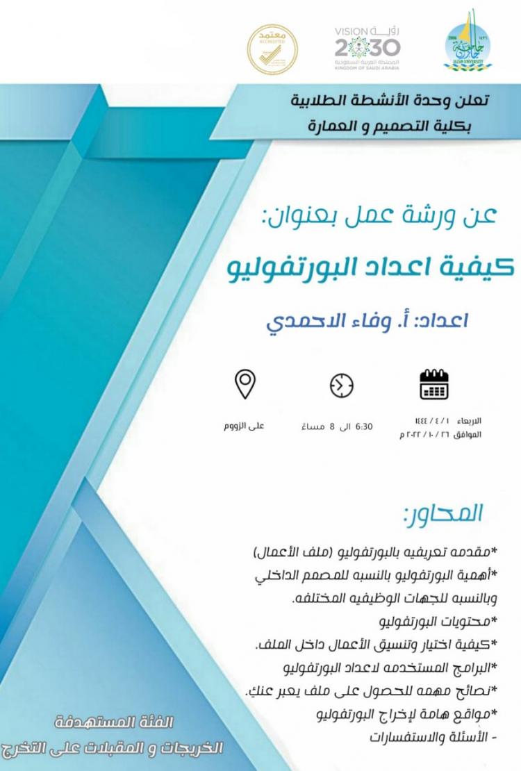 نفذت وحدة النشاط الطلابي بكلية التصميم والعمارة ورشة بعنوان ( كيفية اعداد البورتفوليو ) تقديم ا. وفاء الأحمدي للطالبات المقبلات على التخرج اشتملت على عدة محاور اهمها مقدمه تعريفيه بالبورتفوليو (ملف الأعمال) و أهميته بالنسبه للمصمم الداخلي وبالنسبه للجهات الوظيفيه المختلفه و كيفية اختيار وتنسيق الأعمال داخل الملف بالاضافة الى البرامج المستخدمه لاعداد البورتفوليو و نصائح مهمه للحصول على ملف يعبر عنك مواقع تهمك لاخراج أعمالك كما هدفت الورشة إلى تدريب الطالبات خاصة المقبلات على التخرج على اعداد البورتفوليو عن طريق البرامج الحديثة مما يتيح لهن الفرصة لتنمية مهارات اعداد البورتفوليو لاستخدمها في حياتهن العملية .