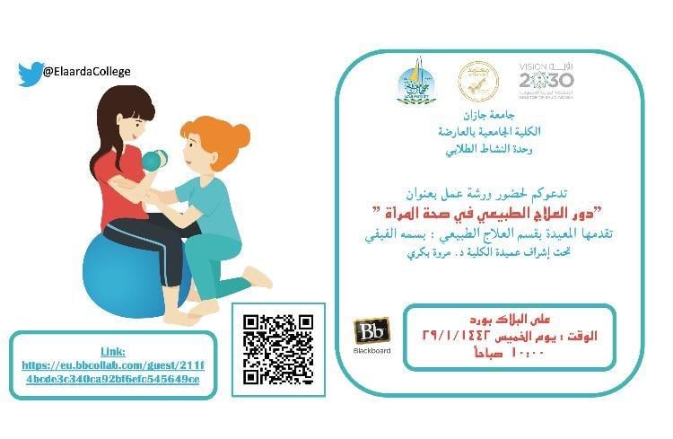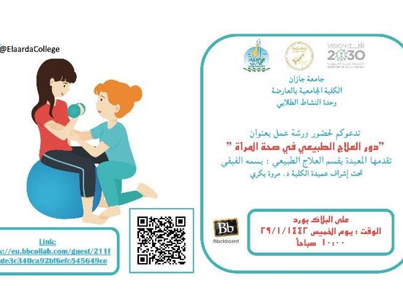 نظمت وحدة النشاط الطلابي بالكلية الجامعية بالعارضة ورشة عمل بعنوان” دور العلاج الطبيعي في صحة المرأة” قدمتها المعيدة بسمة الفيفي من قسم العلاج الطبيعي، بهدف التعريف بأهمية وفوائد العلاج الطبيعي لصحة المرأة، وتم تنفيذ الورشة على البلاك بورد بحضور عدد 30 طالبة .