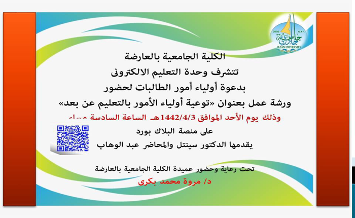 من جانب آخر نظمت الكلية ورشة عمل بعنوان ” توعية أولياء الأمور بالتعليم الالكتروني” استهدفت أولياء أمور الطالبات قدمها كل من الدكتور سنتل كومار من قسم العلاج الطبيعي والمحاضر عبدالوهاب محمد سعيد من قسم اللغة الانجليزية هدفت إلى إنشاء تواصل بين أولياء الأمور والكلية الجامعية بالعارضة.