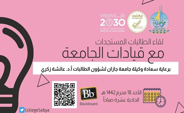 برعاية وكيلة جامعة جازان لشؤون الطالبات الأستاذة الدكتورة عائشة بنت حسن زكري نظمت الكلية الجامعية بصبيا ممثلة في وحدة النشاط الطلابي لقاءً مفتوحاً للطالبات المستجدات للعام الجامعي 1441 – 1442 هـ وذلك لاستعراض تساؤلاتهن واستفساراتهن حول الدراسة الجامعية بحضور وكيلة عمادة القبول و التسجيل د. سحر سلام، و وكيلة عمادة شؤون الطلاب لشطر الطالبات د. فاطمة عقيلي. وعدد من الطالبات المستجدات.