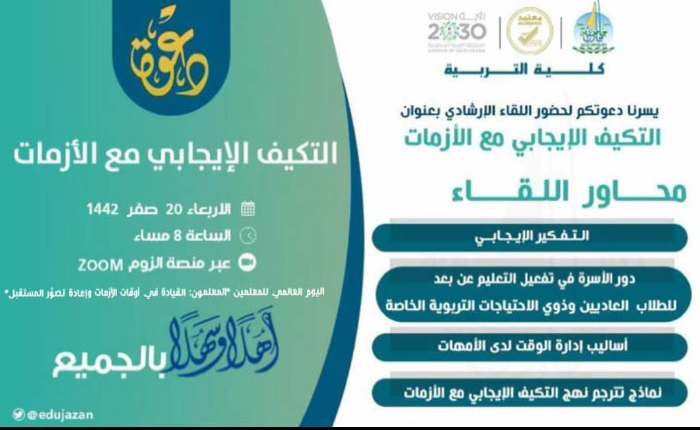 برعاية وكيل الجامعة للشؤون الأكاديمية الدكتور حسن إسحاق دشنت كلية التربية لقائها الإرشادي بعنوان (التكيف الإيجابي مع الأزمات) حيث استهل اللقاء بكلمة عميد كلية التربية د. خالد بن حسين موكلي ألقاها نيابة عنه وكيل الكلية للشؤون الأكاديمية أ.د علي بن محمد جباري، ثم كلمة رئيس قسم علم النفس د.حسن بن إدريس الصميلي والذي أشاد في كلمته بالجهود التي قدمتها المملكة في ظل جائحة كورونا، وكيف جعلت الشعب متمرن للتكيف في أي أزمة طارئة ثم مداخلة الدكتور عيسى بن علي عضابي أستاذ مساعد بقسم التربية الخاصة أشار بأن هذه الجائحة قدمت إفادة لذوي الإعاقة الخاصة وأن لهم دور فعال في الاستفادة من التعليم عن بعد وسرعة تكيفهم.