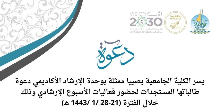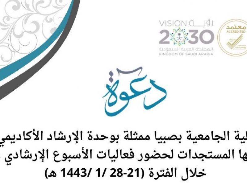 نظمت الكلية الجامعية بصبيا متمثلةً بوحدة الإرشاد الأكاديمي بإشراف ومتابعة من سعادة عميدة الكلية د. فاطمة بريك، فعاليات الأسبوع الإرشادي للطالبات المستجدات خلال الفترة 21-1-1443هـ إلى 28-1-1443 هــ ويتضمن التالي: