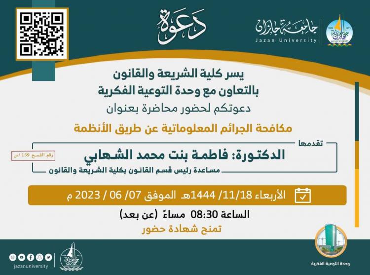 يسر #جامعة_جازان ممثلة بكلية الشريعة والقانون، بالتعاون مع وحدة التوعية الفكرية دعوتكم لحضور محاضرة بعنوان: مكافحة الجرائم المعلوماتية عن طريق الأنظمة. يوم غد الأربعاء 1444/11/18هـ الساعة 8:30 مساءً، عن طريق (الزوم) على الرابط التالي: