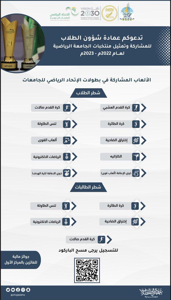 تدعوكم عمادة شؤون الطلاب للتسجيل للمشاركة والانضمام لمنتخبات الجامعة الرياضية للعام 1444هـ #طلبه_جامعه_جازان #انشطه_جامعه_جازان