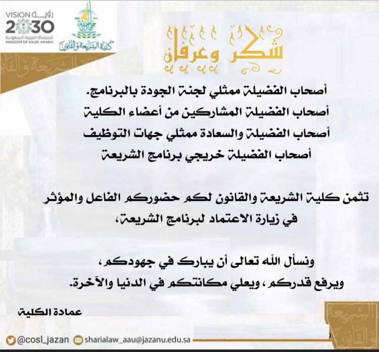 تثمن كلية الشريعة والقانون لكم حضوركم الفاعل والمؤثر في زيارة الاعتماد لبرنامج الشريعة، ونسأل الله تعالى أن يبارك في جهودكم، ويرفع قدركم، ويعلي مكانتكم في الدنيا والآخرة.