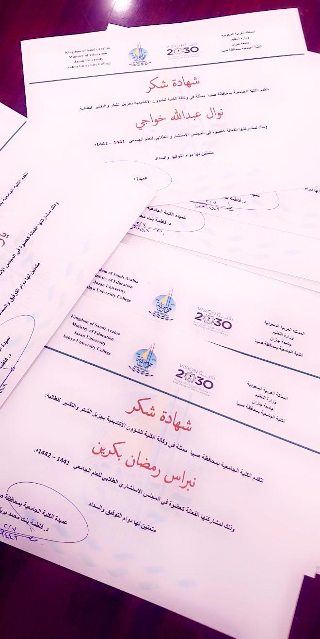 نظمت الكلية الجامعية بصبيا يوم الاربعاء الموافق ٨-٢-١٤٤٣هـ لقاء بطالبات المجلس الإستشاري الطلابي للعام الجامعي ١٤٤١-١٤٤٢هـ.