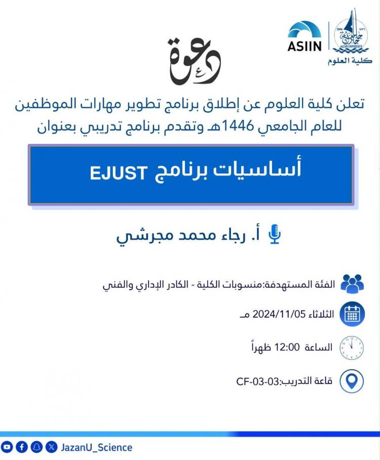 في مبادرة سابقة من نوعها نفذت كلية العلوم برنامج تطويري والذي يتضمن سلسلة من الدورات التدريبية التي ينفذها الموظفين والموظفات. حيث تضمت الدورات عدة مجالات منها دورات في تعليم برنامج r-just وبرنامج E- just، والأمن والسلامة في المختبرات ، وكيفية الاستفادة من برامج قوقل ، ودورات في تطوير الذات مثل دورة طور ذاتك والذكاء العاطفي والاحتراق الوظيفي واخلاقيات العمل وغيرها من الدورات . وقد روعي في جميع الدورات والتي تندرج ضمن حزمة من الدورات التدريبية القصيرة، أن تغطي التخصصات المختلفة التي يحتاج إليها الموظف لرفع مهاراته وقدراتها الوظيفية والإبداعية، وبما ينعكس إيجابًا على أداءه الوظيفي. وتسعى الكلية إلى الارتقاء بمستوى أداء الجهات بشكل ينعكس إيجابا على أداء الجامعة .