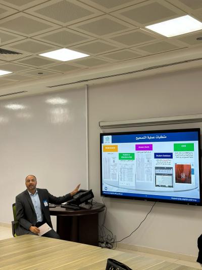 والقى مقدم الدورة الدكتور احمد عوض عبدالجواد محاضرة حول الإرشادات الخاصة بعملية التصحيح بالنسبة للطلاب والمراقبون وأساتذة المقررات ومنسقو المقررات، ثم عرج على المتطلبات اللازمة لعمية التصحيح وخطوات التصحيح وتصدير النتائج.