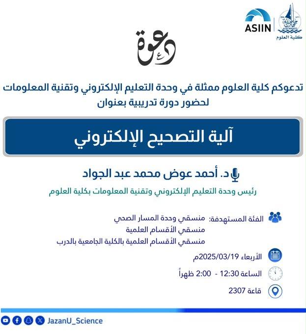 برعاية عميد كلية العلوم بالإنابة الدكتور عبدالله بن يحيى مشرقي نفذت وحدة التعليم الإلكتروني وتقنية المعلومات بالتعاون مع وحدة المسار الصحي دورة تدريبية بعنون "آلية التصحيح الآلي للاختبارات باستخدام OMR" بقاعة التدريب بكلية العلوم .