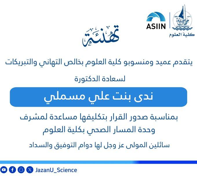 تهنئة| يتقدم عميد ومنسوبو كلية العلوم بخالص التهاني والتبريكات للدكتورة ندى مسملي بمناسبة صدور القرار بتكليفها مساعدة للمشرف على وحدة المسار الصحي بكلية العلوم.