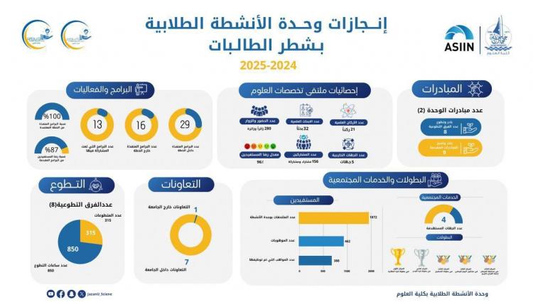 نظمت كلية العلوم حفل ختام الأنشطة الطلابية للعام الجامعي ١٤٤٦هـ، برعاية عميد كلية العلوم الدكتور حسين بن موسى الناشري وبحضور وكلاء ورؤساء الأقسام وأعضاء هيئة التدريس والطلاب والجهات المتعاونة.