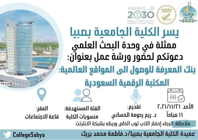 نظمت الكلية الجامعية بصبيا ممثلةً بوحدة البحث العلمي بالتعاون مع قسم التمريض ورشة عمل بعنوان ” بنك المعرفة للوصول إلى المواقع العالمية " المكتبة الرقمية السعودية” قدمتها الدكتورة ريم رحومة الحساني حضوريا في الكلية الجامعية بصبيا حيث تستهدف هذه الفعالية عضوات هيئة التدريس بالكلية و الطالبات لما يتطلبه الموضوع من أهمية في المسار العلمي والبحثي إذ تعد المكتبة الرقمية السعودية أكبر تجمع أكاديمي لمصادر المعلومات في العالم العربي، حيث تضم أكثر من 310 ألف مرجع علمي، تغطي كافة التخصصات الأكاديمية. فهي تعمل