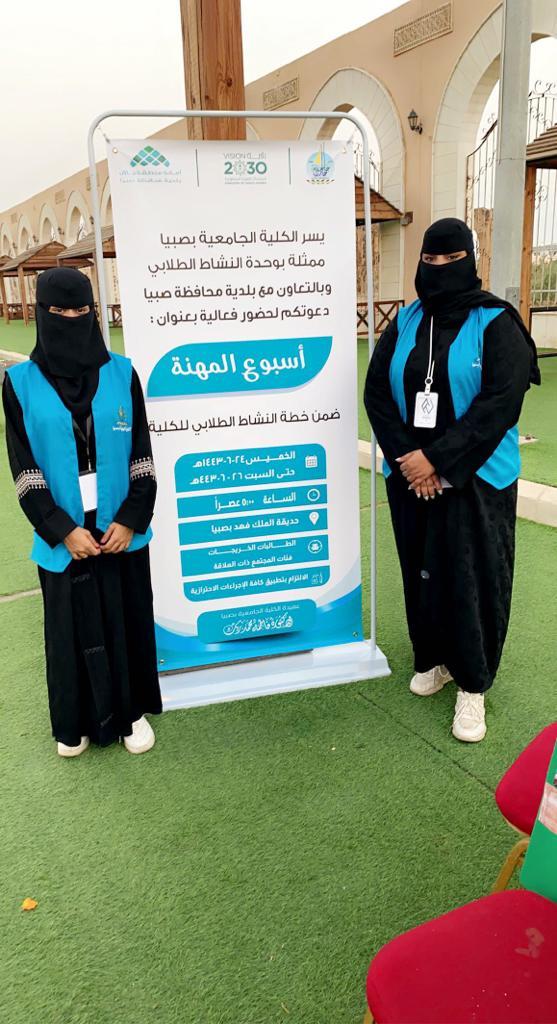 نفذت الكلية الجامعية بصبيا متمثلة بوحدة النشاط الطلابي بالتعاون مع بلدیة محافظة صبیا وباشراف العميدة د.فاطمة بريك فعالية اليوم العالمي للمهنة خلال الفترة من الخمیس ١٤٤٣/٠٦/٢٤ وحتى السبت ١٤٤٣/٠٦/٢٦ھـ بحديقة الملك فهد بصبیا.