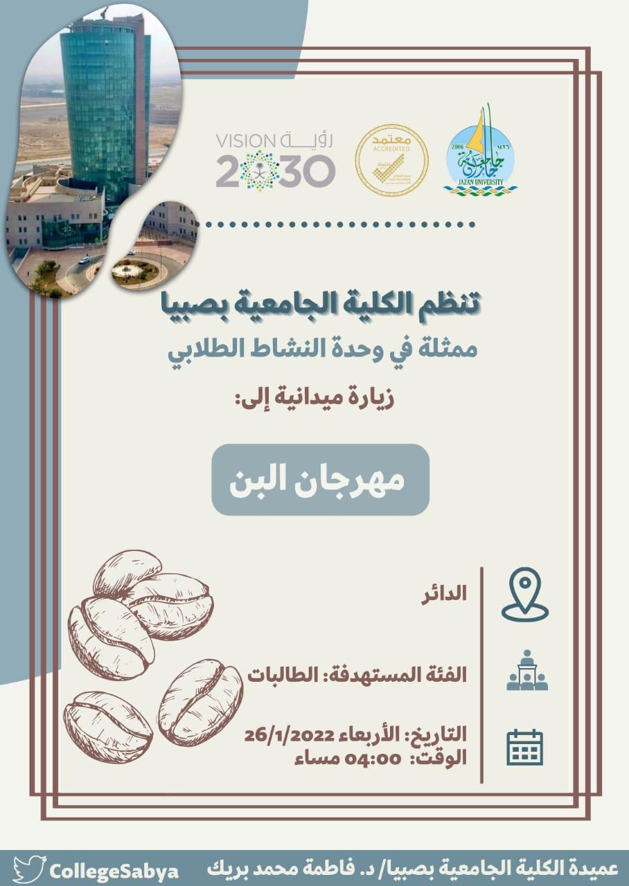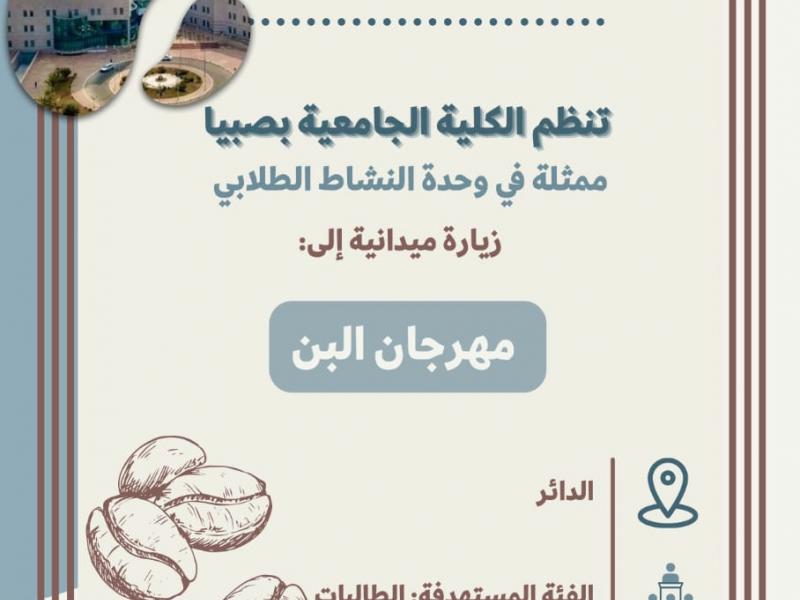 نفذت الكلية الجامعية بصبيا متمثلةً في وحدة النشاط الطلابي وباشراف العميدة د.فاطمة بريك زيارة ميدانية إلى مهرجان البن في محافظة الدائر شارك فيها عدد من منسوبات الكلية وطالباتها.