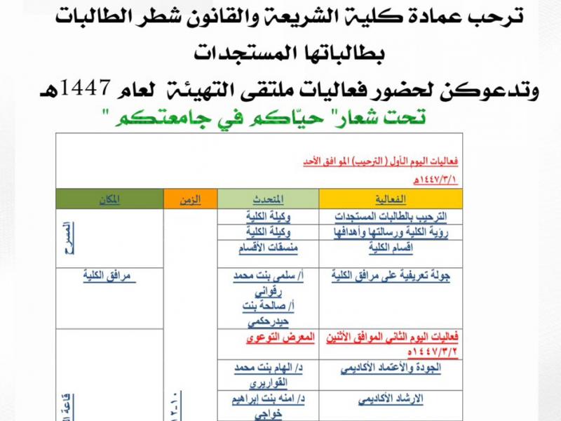كلية الشريعة والقانون شطر الطالبات تواصل فعاليات ملتقى التهيئة لطالباتها المستجدات