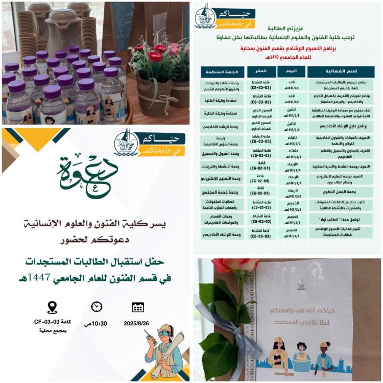 وقد اشتمل الحفل على مجموعة متنوعة من الفقرات التي هدفت لدعم الطالبات المستجدات وتعزيز انضمامهم للكلية، علاوة على لتفعيل القسم لفقرات الأسبوع الإرشادي والتي هدفت لتوضيح كل ما تحتاجه الطالبة في حياتها الجامعية.