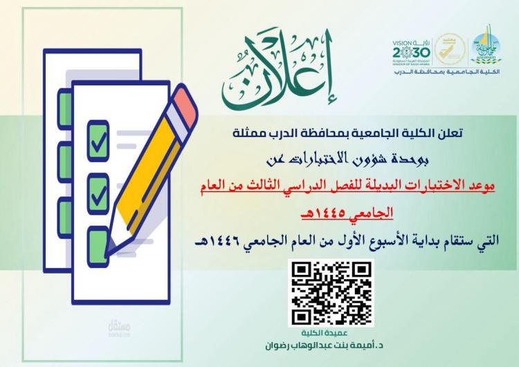 موعد الاختبارات البديلة للفصل الدراسي الثالث من العام الجامعي ١٤٤٥ه بالكلية الجامعية بالدرب