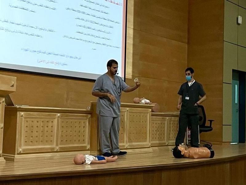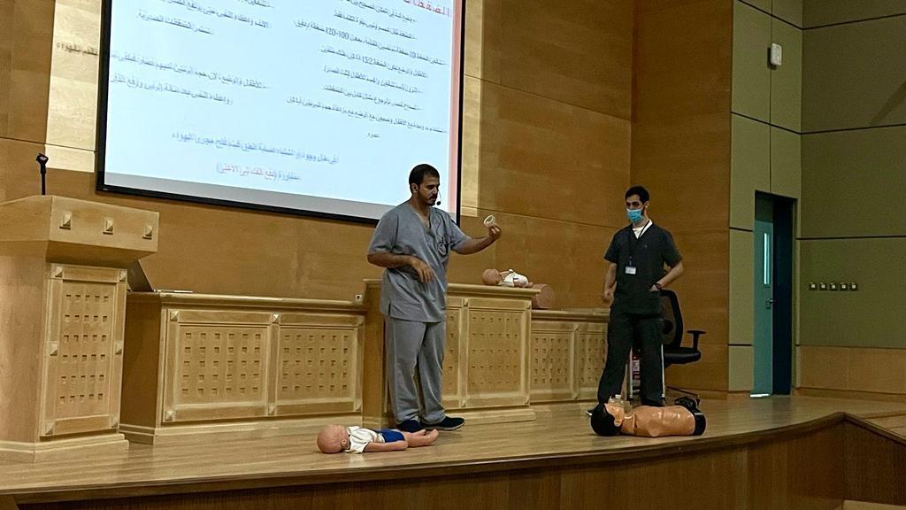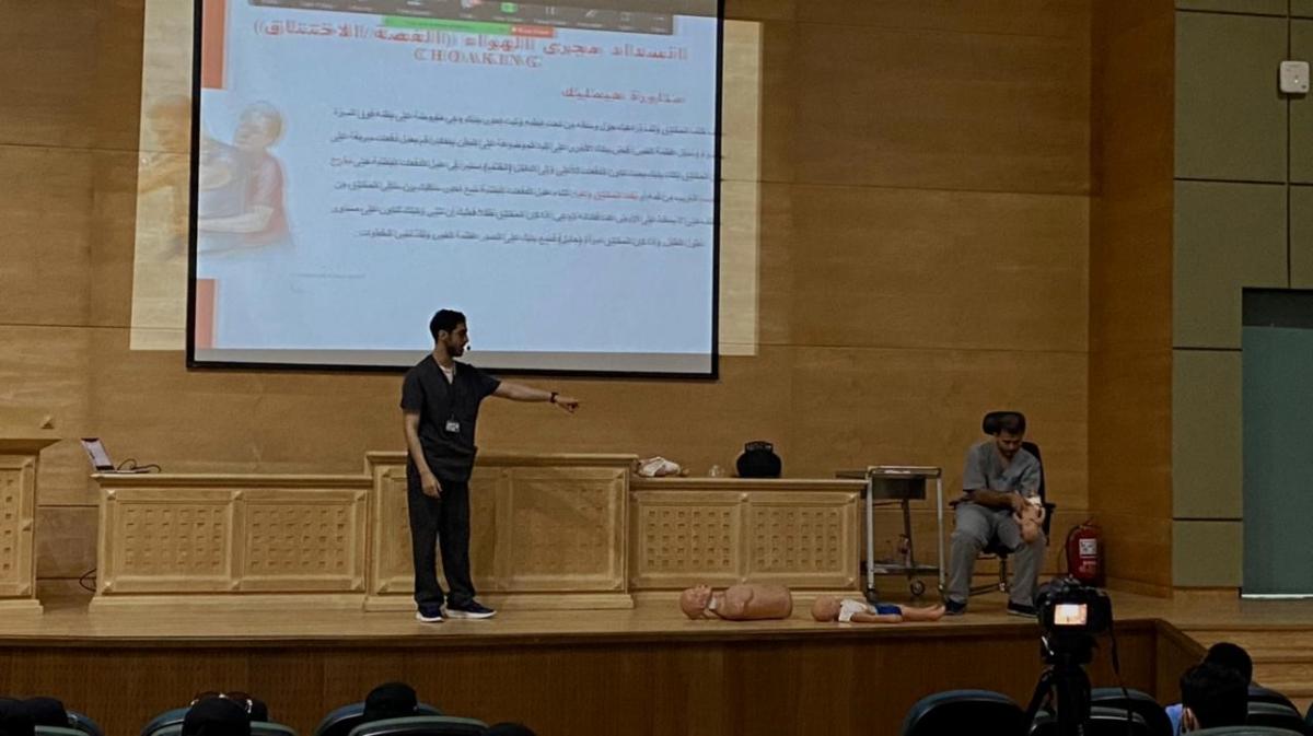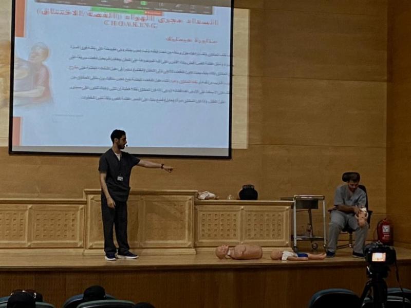 وأعضاء هيئة التدريس من اقسام الكلية المختلفة وعدد كبير من طلاب الكلية وتم استعراض شرائح تقديم توضيحية لبعض الحالات الطارئة مثل الاختناق، النزيف الحاد، وتوقف القلب المفاجئ