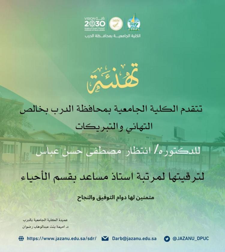 يتقدم قسم الاحياء بخالص التهاني والتبريكات الدكتورة انتظار مصطفي عباس لترقيتها لدرجة استاذ مساعد بقسم الاحياء ونتمني لها حياة عملية حافلة بالنجاحات