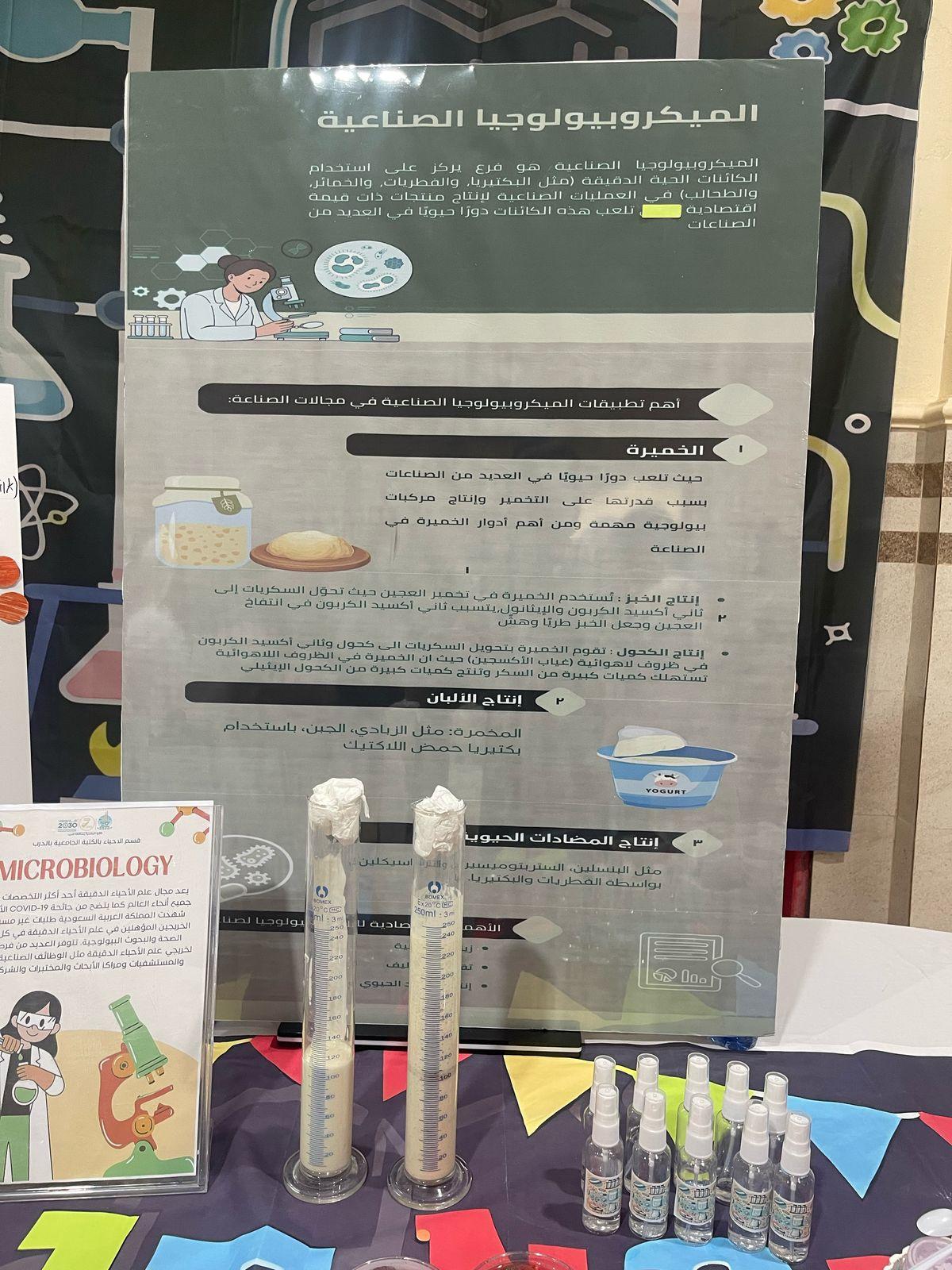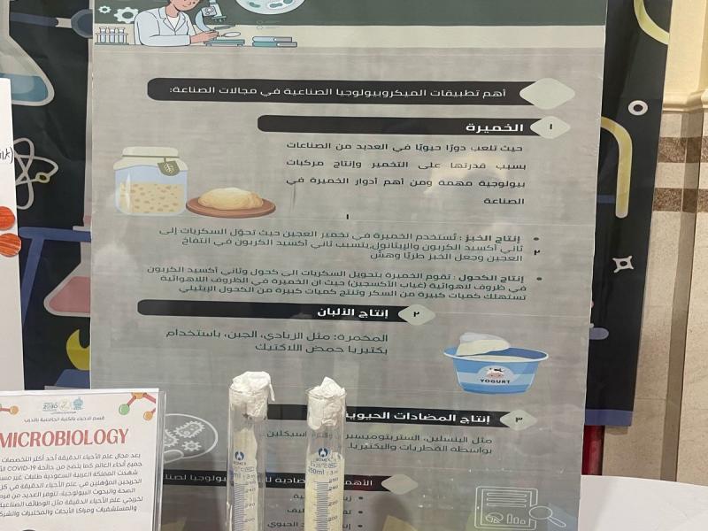 أقام قسم الأحياء بالكلية الجامعية بالدرب معرضًا مميزًا تحت عنوان "الميكروبات الصناعية"، والذي استقطب اهتمامًا واسعًا من الطالبات ومنسوبات الكلية على حد سواء. وقد تميز المعرض بتنوع أقسامه التي شملت: الزراعة والميكروبات، والصناعة والميكروبات، والتغذية والميكروبات، والميكروبات الطبية.