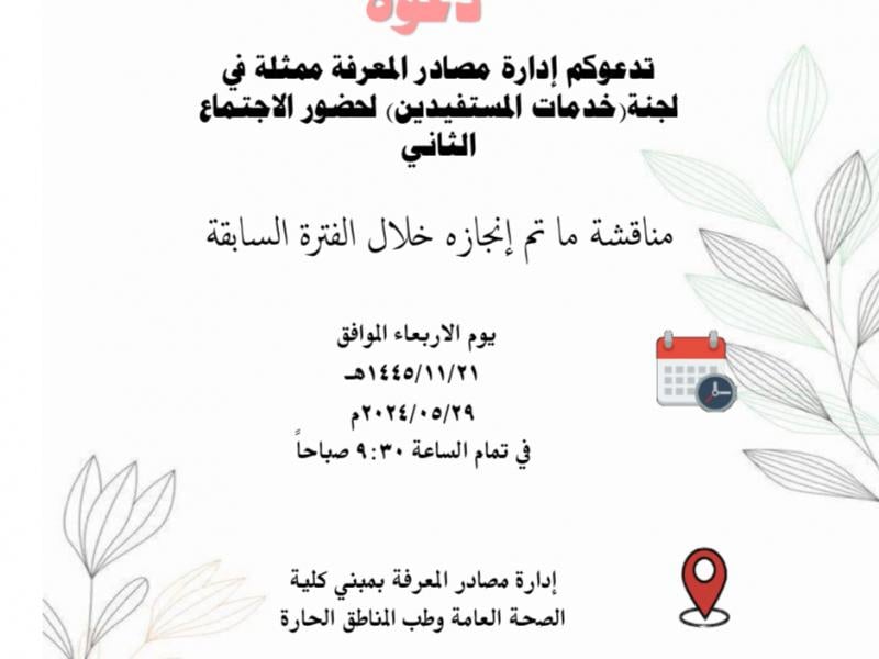 يقام غدا الاربعاء الاجتماع الثاني للجنة خدمات المستفيدين بإدارة مصادر المعرفة لمناقشة ما تم انجازه خلال الفترة السابقة.