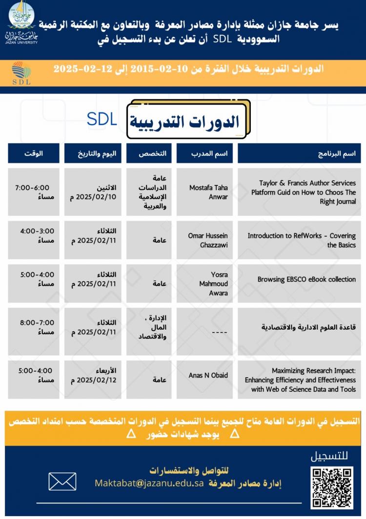 مصادر المعرفة وبالتعاون مع المكتبة الرقمية السعودية يسرها ان تعلن عن بدء التسجيل في الدورات التدريبية خلال الفترة من ١٠-٠٢-٢٠٢٥ الى ١٢-٠٢-٢٠٢٥
