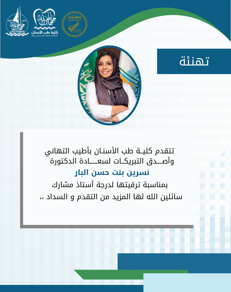 صدر يوم الأربعاء الحادي عشر من أكتوبر قرار موافقة رئيس جامعة جيزان الدكتور مرعي القحطاني على الترقية العلمية للدكتورة نسرين بنت حسن البار عميدة كلية طب الأسنان إلى درجة أستاذ مشارك ،،