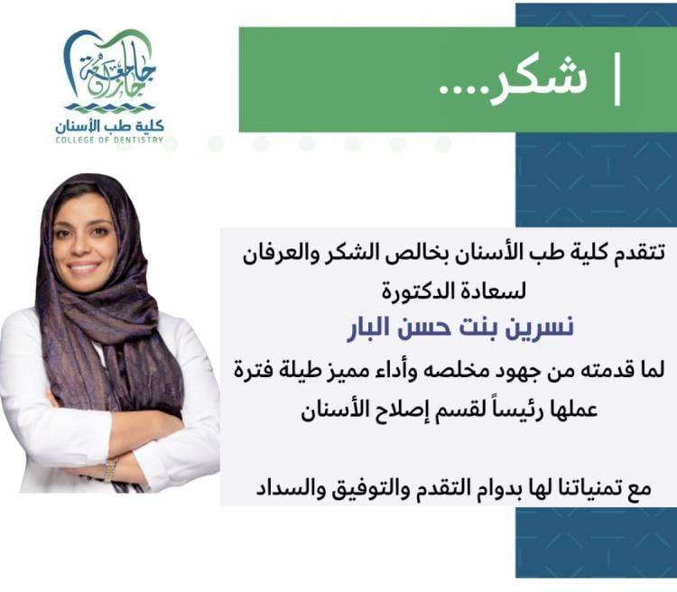 يتقدم منسوبي الكلية ببالغ الشكر و العرفان للدكتورة نسرين بنت حسن البار على ما قدمته من جهود ملموسه خلال تكليفها رئاسة قسم علوم إصلاح الأسنان بالكلية ، مثمنين و مقدرين هذة الجهود و سائلين الله لها دوام التوفيق و السداد ..
