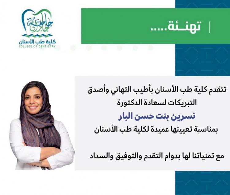 من جهتها يتقدم منسوبي كلية طب الأسنان بخالص التهاني والتبريكات للدكتورة نسرين البار على هذه الثقة داعين الله لها دوام التوفيق والنجاح ..