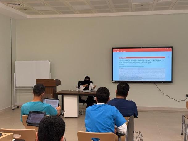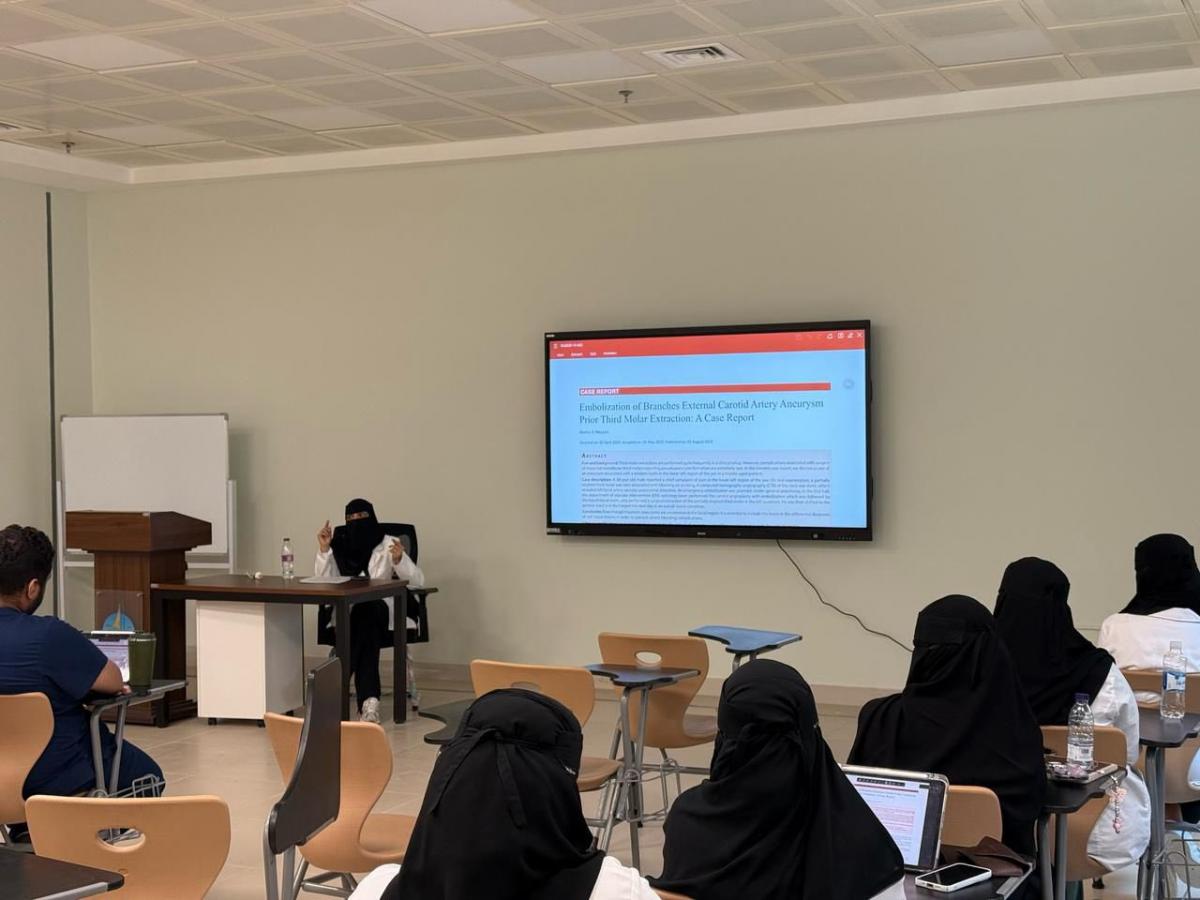 تم خلال اللقاء مناقشة حالة سريرية بعنوان "تخثير شرايين أم الدم في الشريان السباتي الخارجي قبل إزالة ضرس العقل الثالث"، حيث قدمت الدكتورة تحليلاً علمياً متعمقاً للحالة، تلا ذلك نقاش علمي غني شارك فيه أعضاء هيئة التدريس والطلاب.