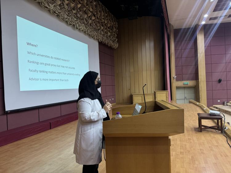 كما وتم طرح الخطة التكاملية لمرحلة الدكتوراة وكيفية تحقيق الأهداف المطلوبة والتطوير البحثي لطالب الدكتوراة و تطرقت أثناء المحاضرة للحديث عن الفرص الوظيفية لحملة شهادة الدكتوراة في جانب الدعم والتشجيع لقطاع البحث والتطوير والابتكار للمؤسسات ومراكز البحوث العلمية في المملكة العربية السعودية .