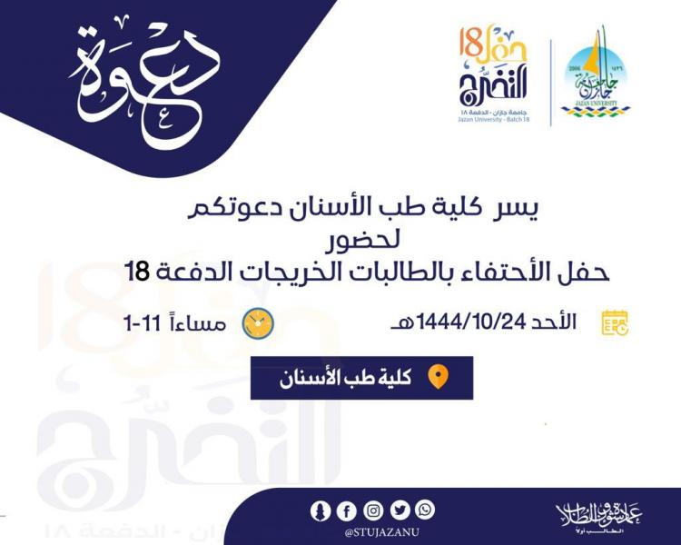 أقامت كلية طب الأسنان بجامعة جازان هذا اليوم الأحد 14 مايو حفلاً لتخرج طالبات الكلية للعام الدراسي 1444 هـ برعاية وكيلة الجامعة لشؤون الطالبات الدكتورة فاطمة بنت عبدالعزيز عقيلي وحضور عميدة كلية طب الأسنان الدكتورة نسرين بنت حسن البار ووكيلة عمادة شؤون الطلاب لشطر الطالبات الدكتورة رشا بنت أحمد المشهور.