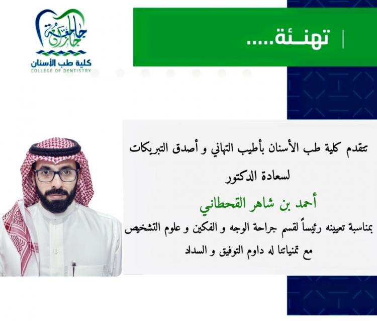 بتكليف الدكتور أحمد بن شاهر القحطاني رئيساً لقسم جراحة الوجه و الفكين و علوم التشخيص بكلية طب الأسنان بجامعة جازان نبارك للدكتور أحمد هذه الثقة و نتمنى له العون و السداد ،،