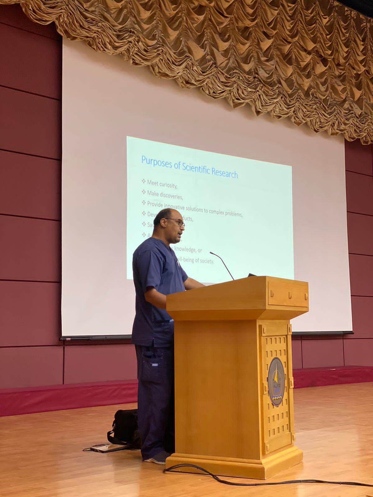 أقامت كلية طب الأسنان بجامعة جازان ممثلة في قسم جراحة الوجه والفكين وعلوم التشخيص يوم الأربعاء الموافق 18 أكتوبر محاضرة بعنوان " Research Methodology” أعدها ونفذها الدكتور عصام حلبوب ، وقد تطرق أثناء المحاضرة لتعريف مناهج البحث العلمي و خصائص مناهج البحث العلمي وكذلك أهمية مناهج البحث و أهداف المنهج العلمي كما و ذكر أنواع مناهج البحث العلمي ، و قد حُضيت المحاضرة بحضور العديد من طلبة الامتياز و أعضاء هيئة التدريس ،،