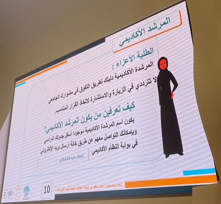 برعاية وكيلة كلية العلوم د. آمنه شماخي وبحضور مساعدات رؤساء الأقسام ومنسقة وحدة الارشاد الطلابي د. نورة العثمان نظمت كلية العلوم وحدة الإرشاد الاكاديمي اللقاء التعريفي للطالبات المستجدات للعام الدراسي 1445هـ-1446هـ والذي استمر لمدة ثلاث أيام وقد تفضلت وكلية الكلية الدكتورة أمنة بإلقاء كلمة ترحيبية للطالبات وتوضيح أهم النقاط التي تساعد الطالبة على نجاح مسيرتها الجامعية كما تفضلت د. نورة العثمان منسقة الإرشاد الطلابي بتقديم عرض مرئي توضحي بكل ما يخص الخطة الدراسية و الإرشاد الأكاديمي والأنشطة الطلابية وتناول العرض شرح مفصل لجميع أقسام الكلية ومرافقها وبعد ذلك قامت وكلية القبول والتسجيل د. سحر سلام بشرح مفصل عن اللوائح والأنظمة ومعايير القبول والتسجيل في الجامعة، وقد قمن مساعدات رؤساء الأقسام (فيزياء –كيمياء – أحياء – رياضيات - المسار الصحي) بتوضيح أهم النقاط التي تفيد الطالبات في مسيرتهن الأكاديمية وتوضح أهمية السجل المهاري للطالبة في مسيرتها الجامعية، و تخلل اللقاء توضيح لأهم الإرشادات الهامة بالكلية وضرورة الالتزام بحضور المحاضرات والالتزام بالزي الرسمي، كما قامت منسقة الأنشطة الطلابية بحث الطالبات على المشاركة في جميع الأنشطة الطلابية ومالها من أثر في صقل شخصية الطالبة ورفع روح الانتماء لديها، وفي ختام اللقاء قدمت منسقة اللقاء الدكتورة نورة العثمان أمنياتها بدوام النجاح والتوفيق للطالبات في مسيرتهن العلمية.