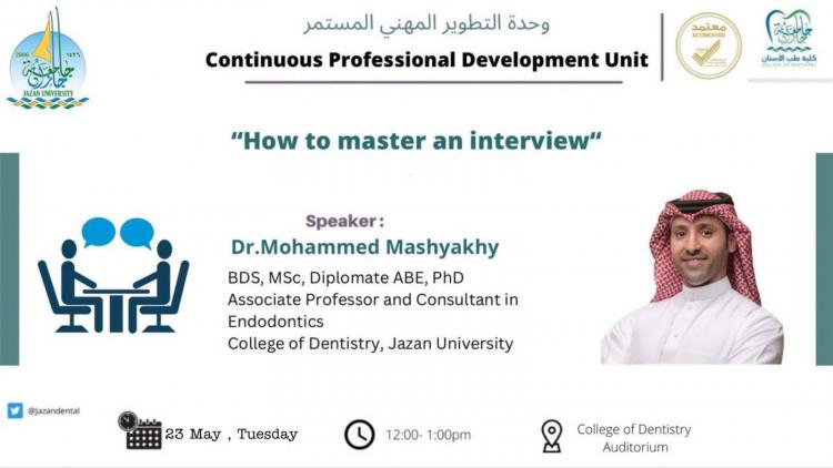 تحدثوا فيها عن طرق المحافظة على السن المتهدم بإطالة التاج . كان ذلك في تمام الساعة 11:00إلى الساعة 11:30 و من ثم تلتها محاضرة قدمها الدكتور/ محمد مشيخي تحدث فيها عن كيفية إتقان المقابلات الشخصية، وذلك في تمام الساعة 12 - 1:00 مساءاً على مسرح الكلية.