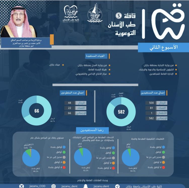 وقد بلغ عدد المستفيدين من خدمات القافلة خلال هذا الأسبوع أكثر من 582 مستفيدًا، حيث تم تقديم فحوصات طبية وإرشادات توعوية حول صحة الفم والأسنان، بالإضافة إلى توزيع مستلزمات العناية بالأسنان.