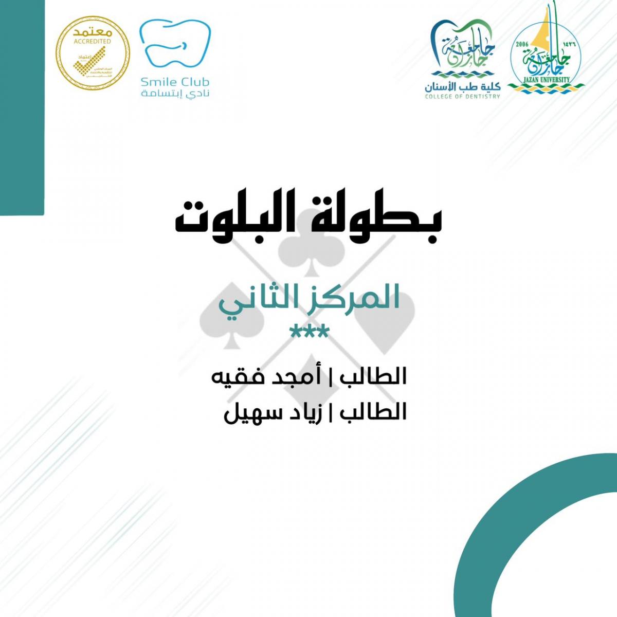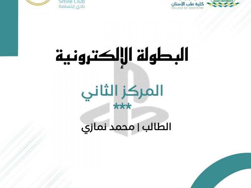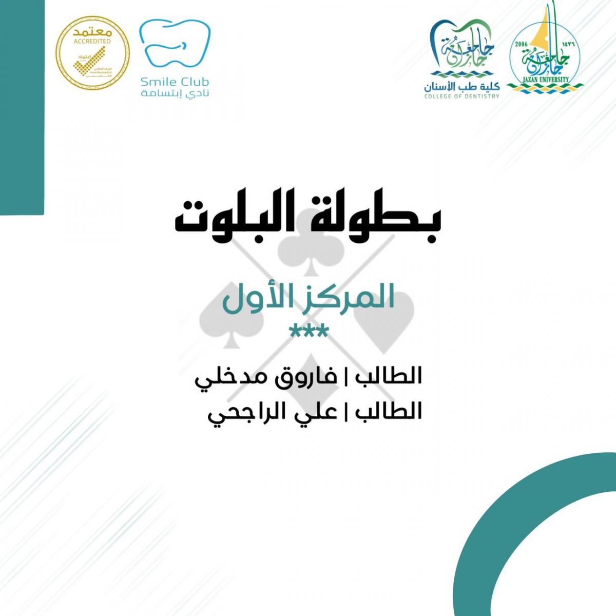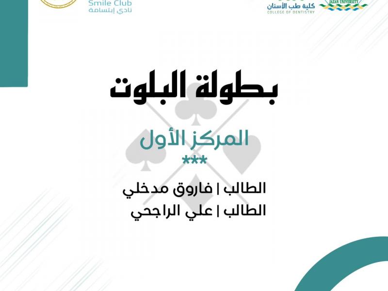 نظمت وحدة الأنشطة الطلابية و نادي ابتسامة الطلابي بكلية طب الأسنان بجامعة جازان ؛ بطولات رياضية متنوعة شملت ( بطولة البلوت ، بطولة تنس الطاولة ، بطولة الشطرنج ، بطولة الألعاب الإلكترونية ) وذلك خلال الفترة من 15 - 19 / 10 /2023 استهدفت جميع منسوبي الكلية من الطلاب و أعضاء الهيئة الإدارية و أعضاء الهيئة التدريسية .