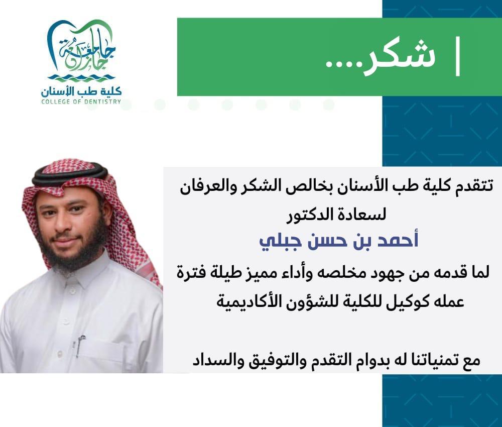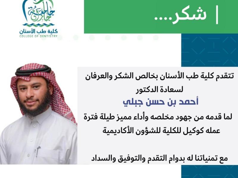 كما وتتجه بجزيل الشكر والتقدير لسعادة الدكتور أحمد بن حسن جبلي على ما قدمه خلال توليه وكالة الكلية للشؤون الأكاديمية حيث شهدت الشؤون الأكاديمية في الكلية خلال فترة تكليفه نقلة نوعية على جميع المستويات ..