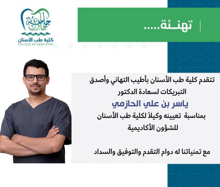 الدكتور « ياسر الحازمي » وكيلاً لكلية طب الأسنان للشؤون الأكاديمية