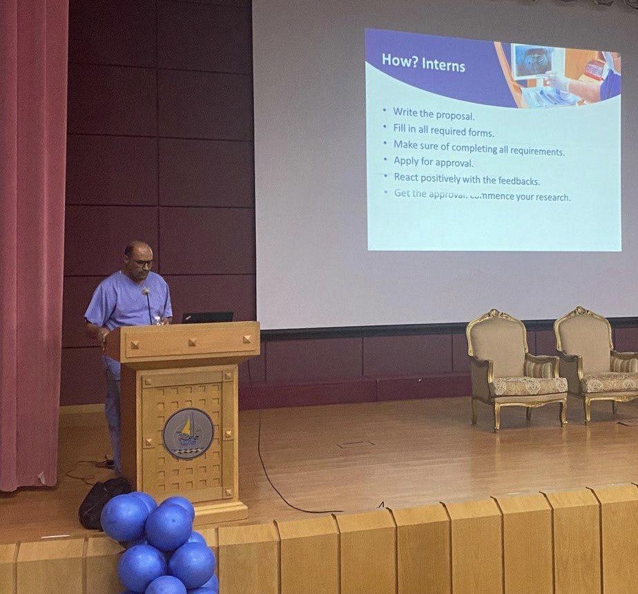تحدث فيها عن أساسيات البحث وأهم النقاط فيه والخطوات المطلوبة ودعمها بالعديد من الأمثلة وحضيت المحاضرة بمشاركة فعّالة من أطباء الامتياز وحضور العديد من أعضاء هيئة التدريس ..