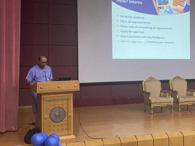 ثم تلتها محاضرة بعنوان ( المنهجية البحثية لأبحاث أطباء الامتياز ) قدمها الدكتور: عصام حلبوب .