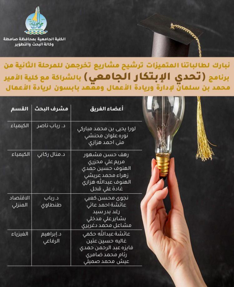تتقدم الكلية الجامعية بصامطة بالتهنئة لطالباتها المتميزات ترشيح مشاريع تخرجهن للمرحلة الثانية من برنامج تحدي الابتكار الجامعي بالشراكة مع كلية الأمير محمد بن سلمان لإدارة وريادة الأعمال ومعهد بابسون لريادة الأعمال. و الشكر موصول لمشرفي الأبحاث. أصدق الدعوات بالتوفيق والتميز.
