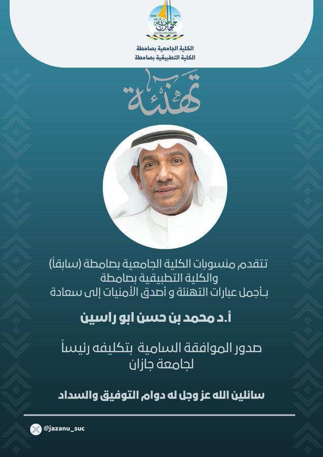 تتقدم الكلية التطبيقية بصامطة والكلية الجامعية بصامطة سابقاً وجميع منسوبيها بخالص التهاني والتبريكات لمعالي الأستاذ الدكتور/ محمد بن حسن أبو راسين بمناسبة صدور الموافقة السامية بتكليفه رئيساً لجامعة جازان سائلين المولى له دوام التوفيق والسداد.