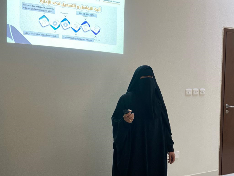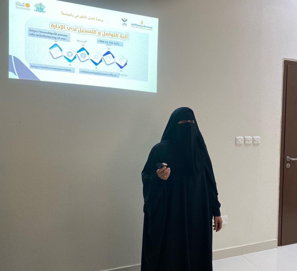 وتحت عنوان (وطن طموح ومواطن مسؤول) تم تعريف الحضور بوحدة العمل التطوعي بجامعة جازان بقيادة عمادة شؤون الطلاب والتي تُعنى بالأعمال التطوعية ضمن فريق متكامل: كفرق الدعم وفرق التصاميم وفرق الإرشاد السياحي وفرق الاستشارة وغيرها وذلك وفق رؤية ورسالة واضحة تهدف إلى نشر ثقافة العمل التطوعي وبناء شراكات مع القطاعات وتأهيل الطلاب بالمهارات اللازمة بهذا الشأن