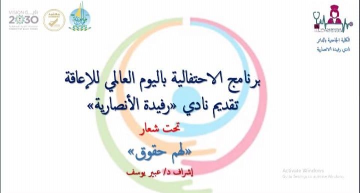برعاية سعادة عميدة الكلية الدكتورة / تنوير احمد هندي قدمت فتيات نادي رفيدة الانصارية برنامج الخدمة المجتمعية للاحتفال باليوم العالمي للاعاقة تحت شعار "لهم حقوق"، انطلقت الفعاليات في تمام الثامنة مساءً بكلمة افتتاحية لسعادة عميدة الكلية تلاها عرض تقديمي بعنوان "متلازمة ليست أزمة" للتعريف بمتلازمة داون و مدى انتشارها بالمملكة و كيفية التشخيص و التعامل مع اصحاب المتلازمة ، مع عروض لافلام وثائقية عن أهم متطلبات و احتياجات اصحاب المتلازمة و بعض برامج الرعاية الخاصة و كذلك عروض لبعض قصص لحالات ناجحة مجتمعيا و رياضيا ، و قد شهد البرنامج إقبالا جيدا من العديد من الطالبات و الأهالي بمحافظة الدائر . و انتهى بفقرة مفتوحة لالقاء الأسئلة.