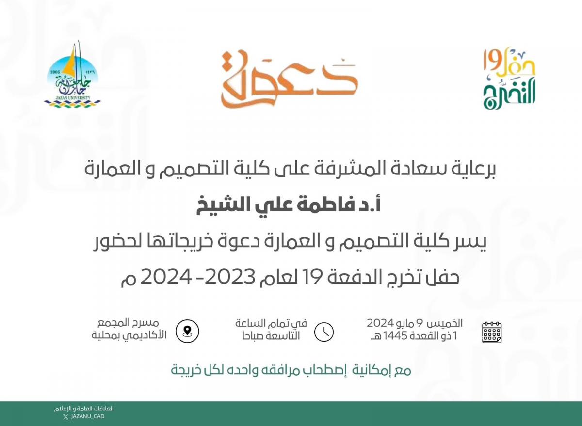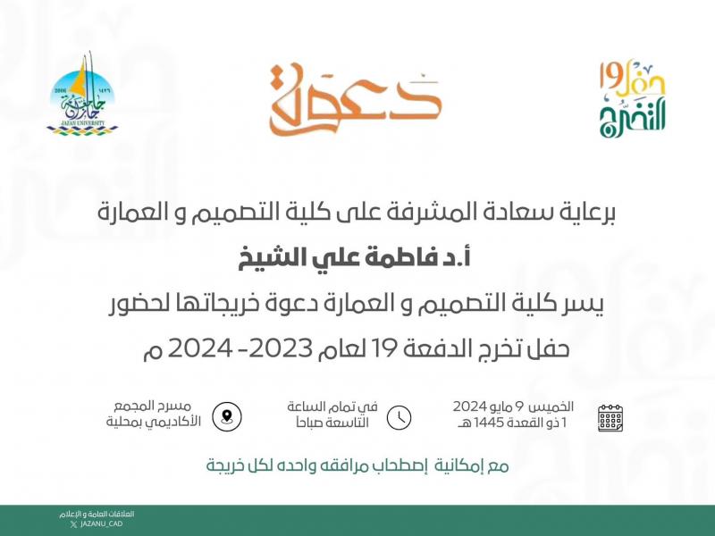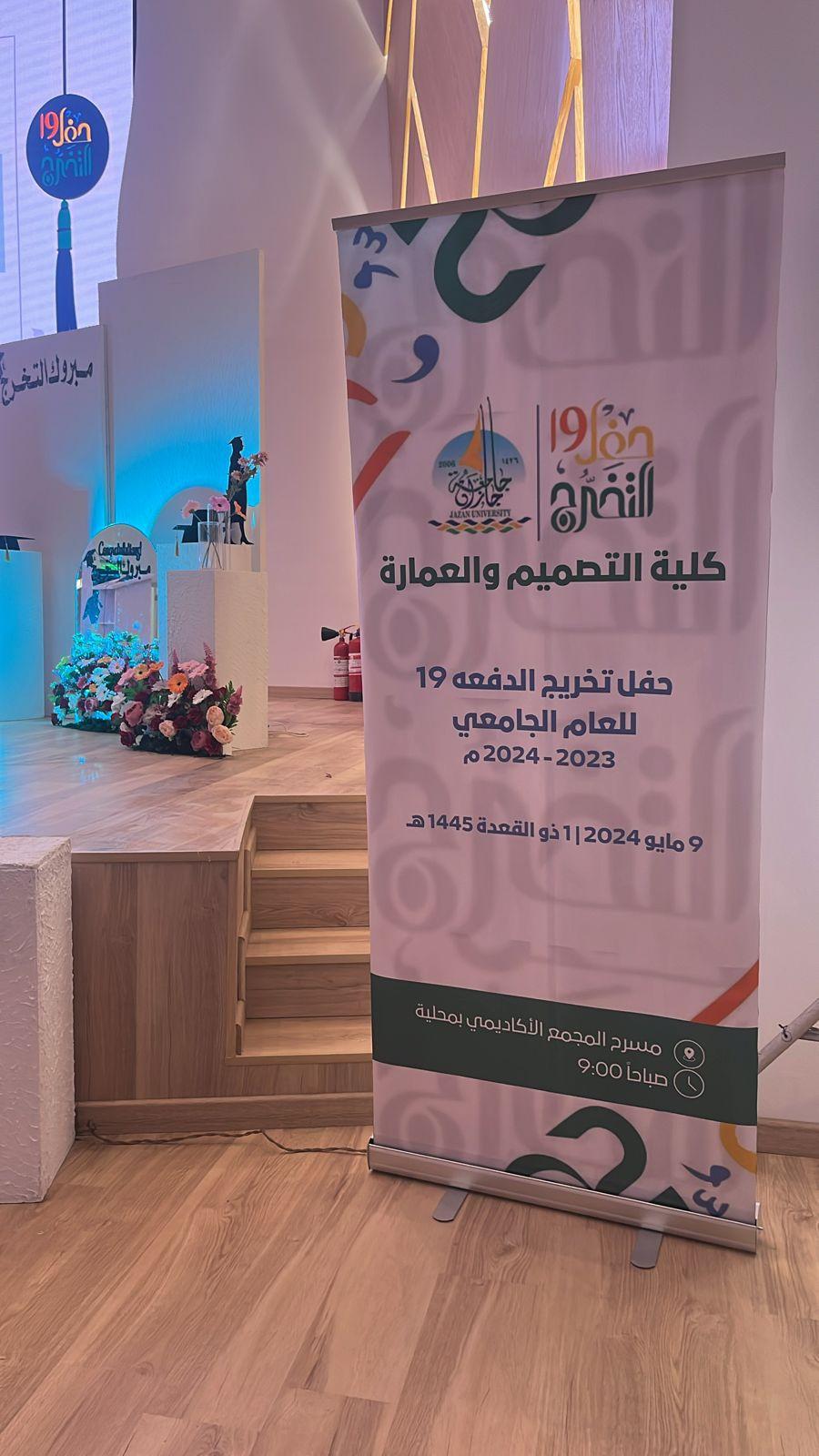 برعاية سعادة المشرفه على كلية التصميم والعمارة " سابقاً " أ.د فاطمة علي الشيخ أقامت الكلية حفل لخريجات قسمي التصميم الداخلي و الفنون التطبيقية 2023-2024م إبتدأ الحفل بالسلام الوطني ثم مسيرة الخريجات تلاه القرآن الكريم وتلا ذلك كلمة راعية الاستاذ الدكتور / فاطمة علي الشيخ .توالت فقرات البرنامج من تقديم كلمة ممثلة الخريجات وقد تم تقديمها من قبل الطالبة بقسم التصميم الداخلي/ شهد نجمي تلاة أداء القسم و أختتم الحفل بتكريم اوائل مصحوباً بعرض أغنية التخرج و فيديو بعرض أسماء الخريجات و بعض أعمالهن الدراسية من تصميم الاستاذه اثير باعشن عضو بالكلية في أجواء يملؤها الفرح و السرور .