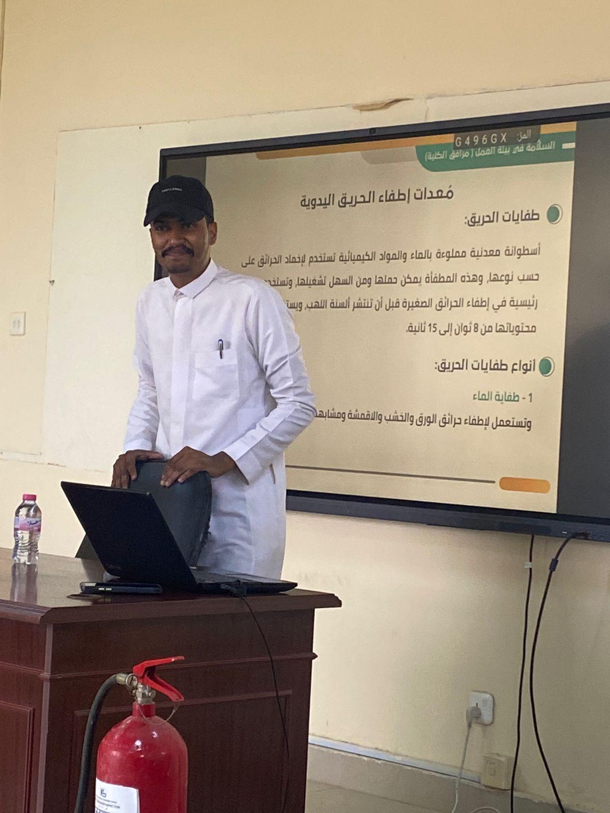 وتناول أنواع المخاطر في بيئة العمل وقواعد السلامة وأنواع الحرائق وآلية التعامل مع كل نوع وأنواع الطفايات وأنظمة الإطفاء وكواشف الدخان والحرائق
