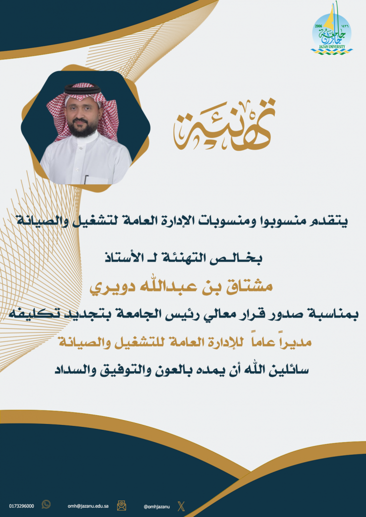 يتقدم منسوبو ومنسوبات الإدارة لتشغيل والصيانة بخالص التهنئة لـ الأستاذ