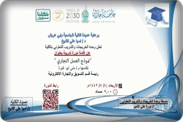 نفذت وحدة الخريجات والتدريب بالكلية فعالية بعنوان (نموذج العمل التجاري ) وذلك يوم الأربعاء الموافق 1442/08/04 هـ بحضور عميدة الكلية د.آسيا علي حيدر الشيخ قدمتها م/منى أبو غبرة رئيسة قسم التسويق والتجارة الإلكترونية وبإشراف وتنسيق من منسقة الوحدة أ. نورة الأمير أستهدفت الفعالية جميع الطالبات المتوقع تخرجهن بالكلية من مختلف اقسام الكلية